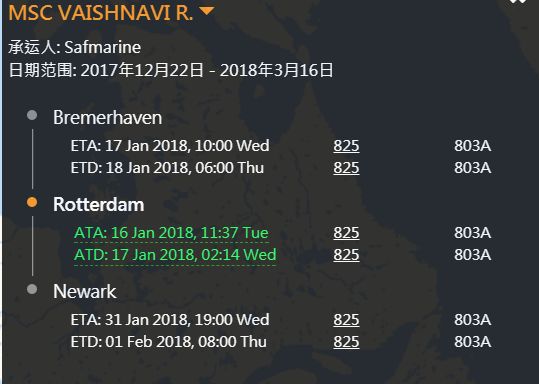 MSC Vaishnavi R運力為4112TEU,往返于大西洋的幾個港口之間,??坎蝗R梅、鹿特丹、紐瓦克港。
