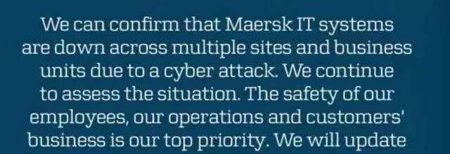 當(dāng)?shù)貢r(shí)間2017年6月27日,馬士基遭遇了一次大規(guī)模的黑客攻擊事件。
