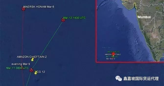 根據(jù)最新消息,截至3月12日,“Maersk Honam”號(hào)AIS信號(hào)顯示可能已經(jīng)被拖往孟買。