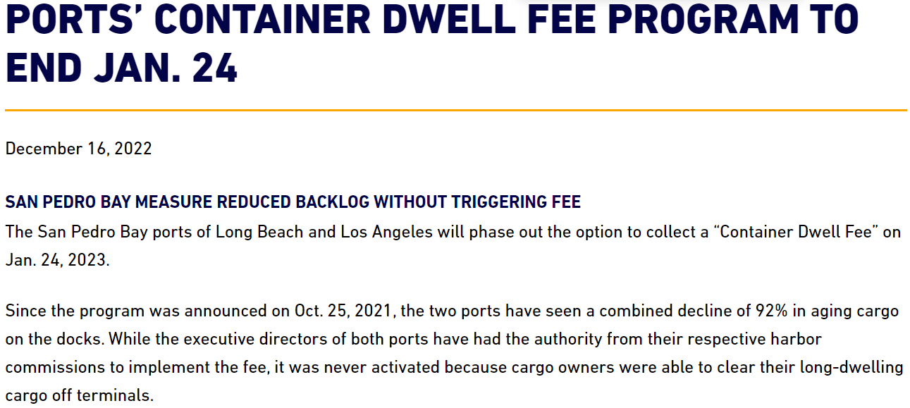 美國洛杉磯港和長灘港日前在一份聲明中表示,從2023年1月24日開始,逐步取消“集裝箱超期滯留費(fèi)”,這可能意味著著美國加州港口貨量激增的狀況已經(jīng)結(jié)束。